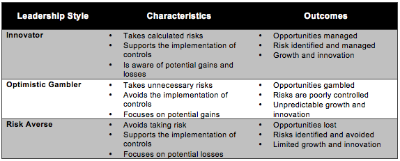 The third type of leader is the innovator. They are a blend of the optimistic gambler and the risk averse. They are pragmatic enough to consider the known risks and implement any required controls, yet remain steadfast in the achievement of future innovation and growth. Their concept of risk reward is similar to that of the optimistic gambler however their appreciation of risk management reflects that of the risk averse leader. Think of the suave heist mastermind played by George Clooney in the movie Ocean’s 11.